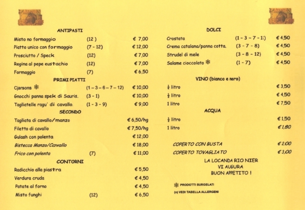 Il ristorante oltre alle specialità carniche e venete offre anche una squisita carne equina alla griglia, inoltre dispone di uno spiedo attrezzato per polli pochette e carni miste.
